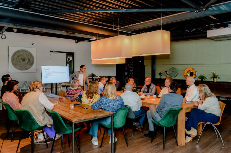 Daar hebben we tijdens het ontbijt een concrete tool voor gebruikt: de Betekenisbox. Leden van de Raad van Betekenis hebben de Betekenisbox ingezet, na een duidelijke uitleg van Kaj Morel - mede-oprichter van de Betekeniseconomie in Twente en ontwikkelaar van de Betekenisbox. Door middel van prikkelende stellingen zijn de leden het gesprek gestart en hebben ze inzicht gekregen in het starten van de transitie. Door samen in groepen te werken - verdeeld over verschillende branches - werd er ook veel nieuwe kennis opgedaan.
